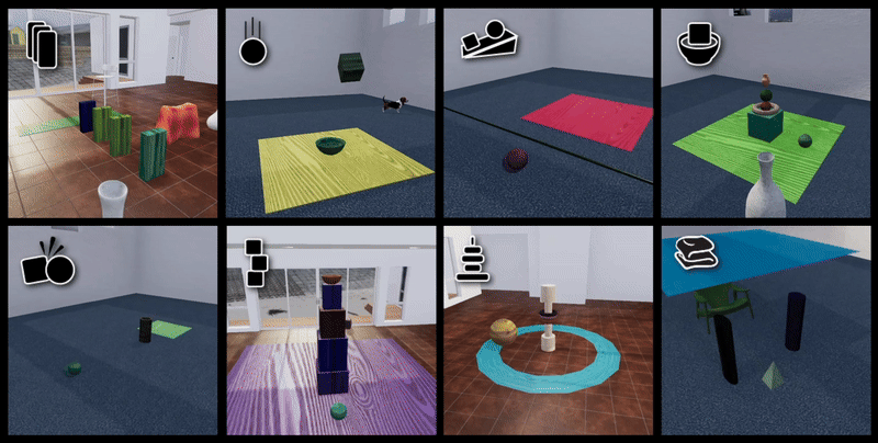 Example simulations from the Physion dataset, illustrating object interactions in physical reasoning tasks [Physion, Bear et al., 2021]
